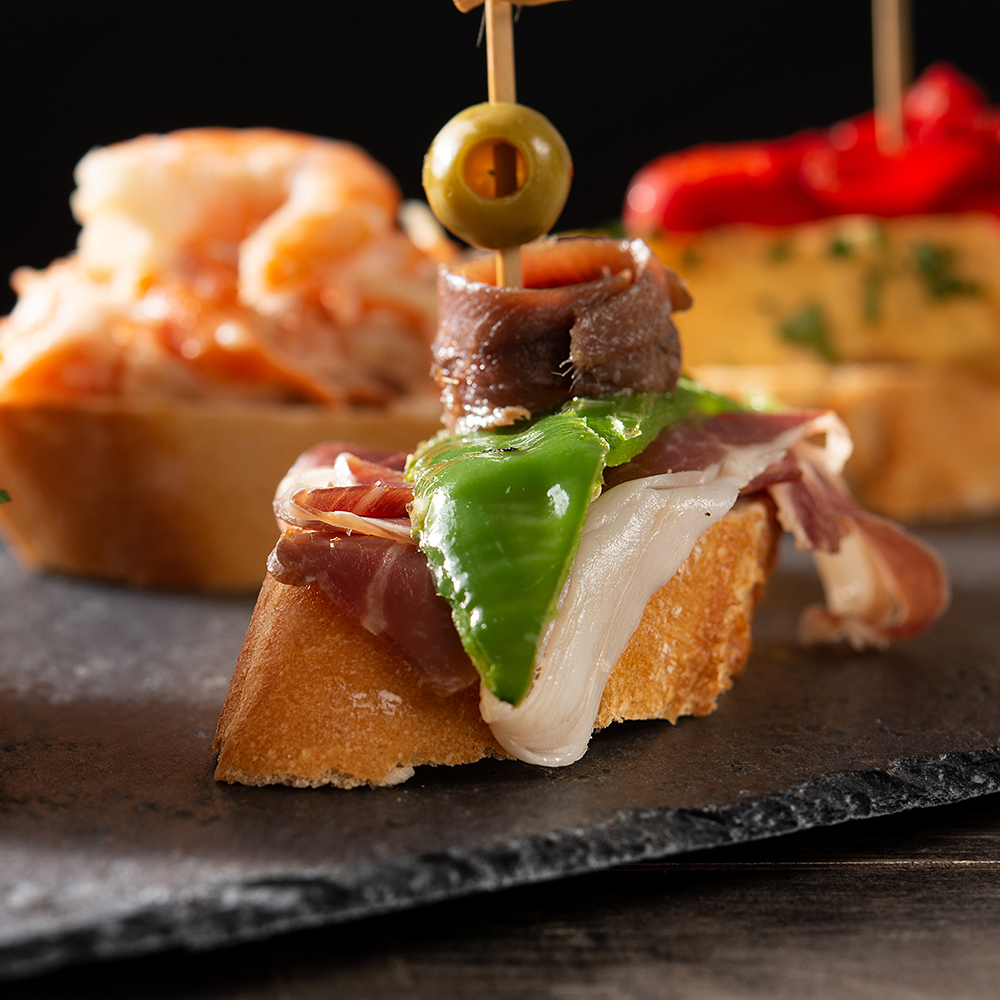 바케트에 아몬드 크림, 하몽, 올리브를 곁들인 타파스